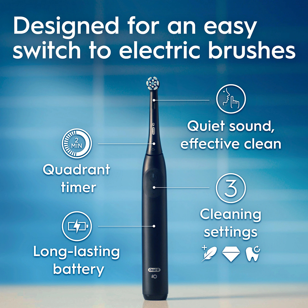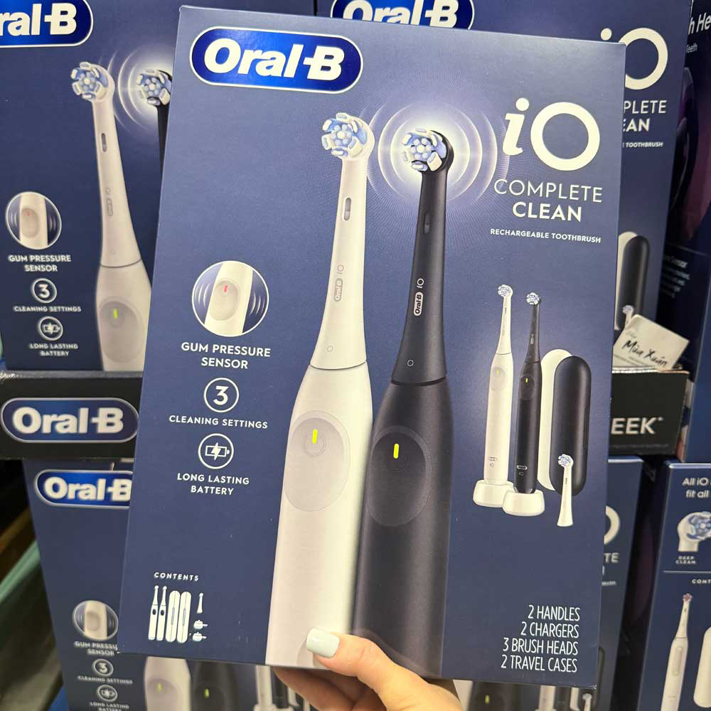 Bàn chải điện Oral-B iO Complete Clean kết hợp các rung động vi mô mạnh mẽ nhưng nhẹ nhàng với đầu bàn chải tròn lấy cảm hứng từ nha sĩ của Oral-B, mang đến hàm răng trắng sáng, khỏe mạnh hơn.