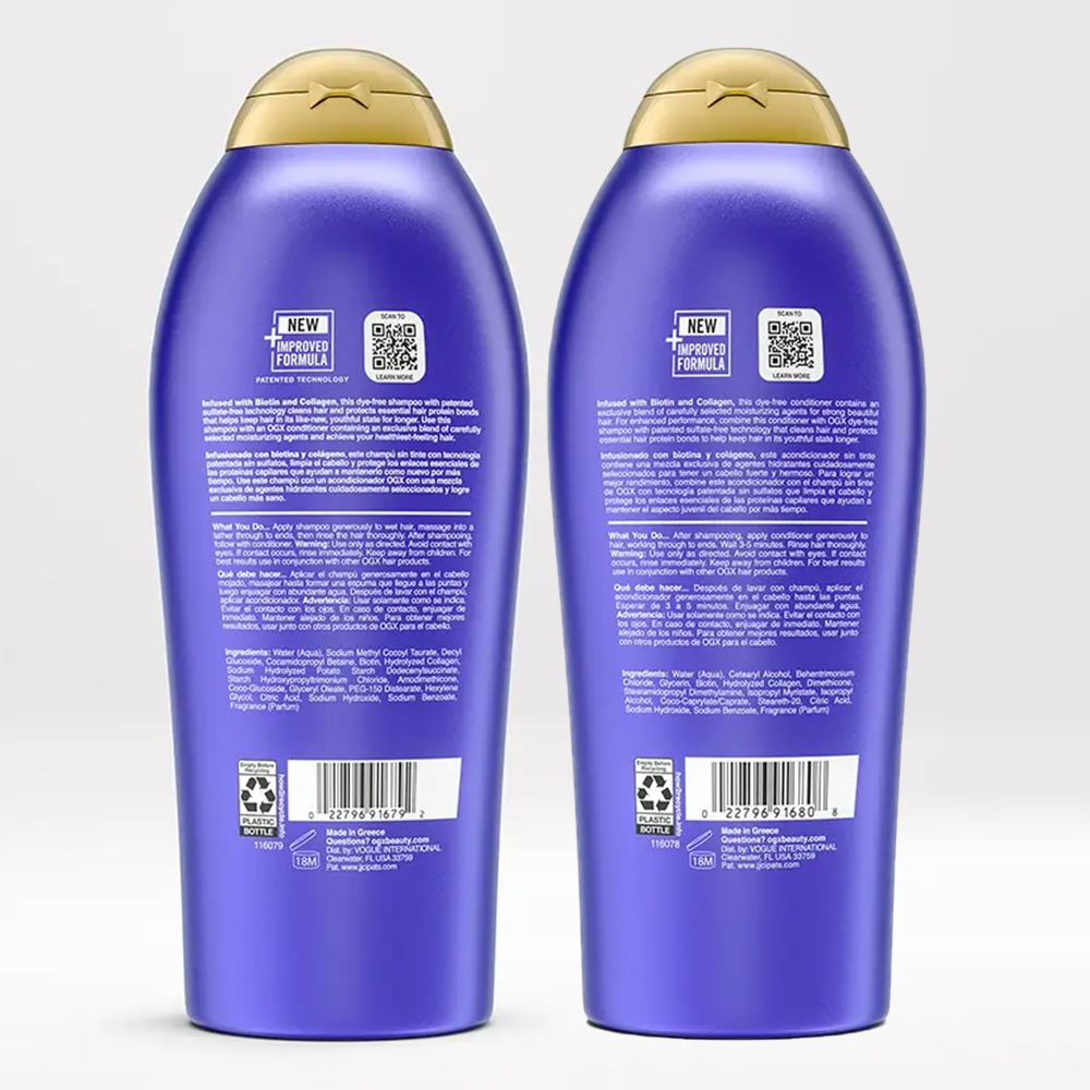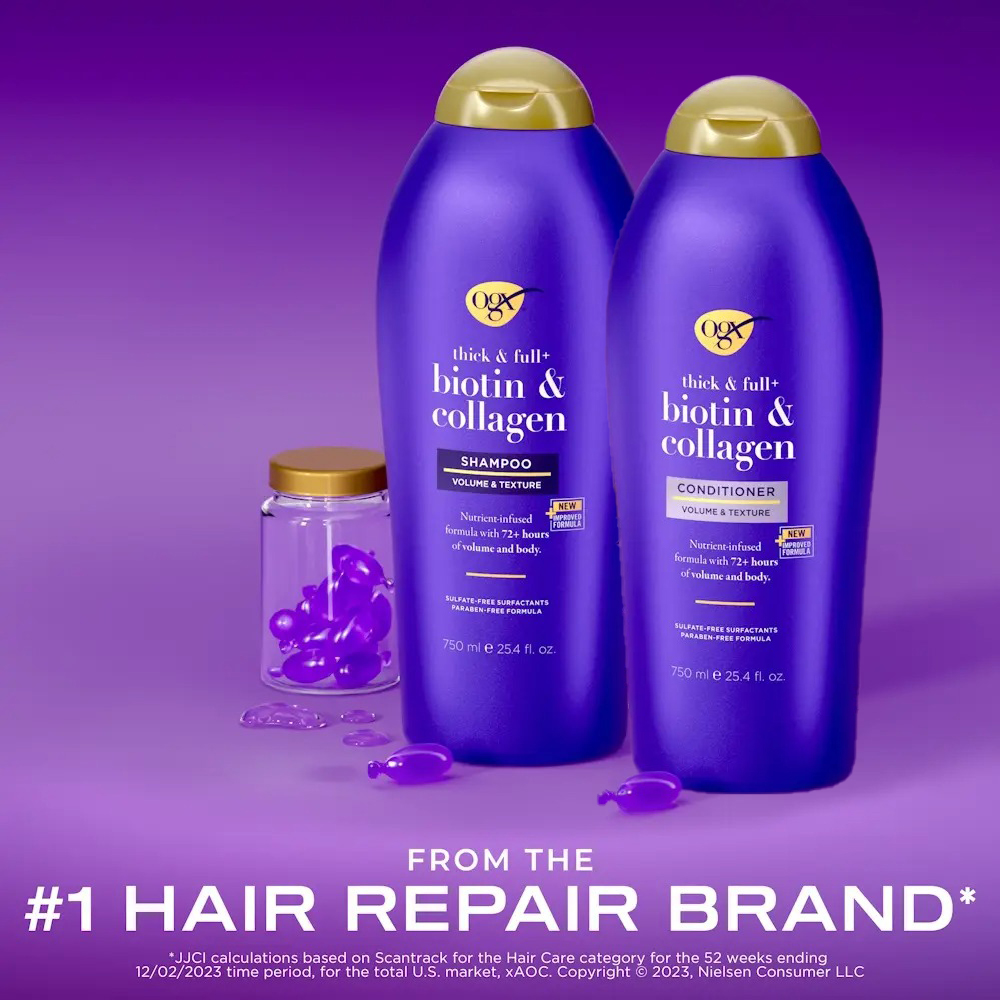 Bộ đôi dầu gội và dầu xả OGX Thick & Full + Biotin & Collagen nhẹ nhàng làm sạch và cung cấp dưỡng chất với biotin & collagen mang lại hơn 72 giờ bồng bềnh & dày dặn cho mái tóc.