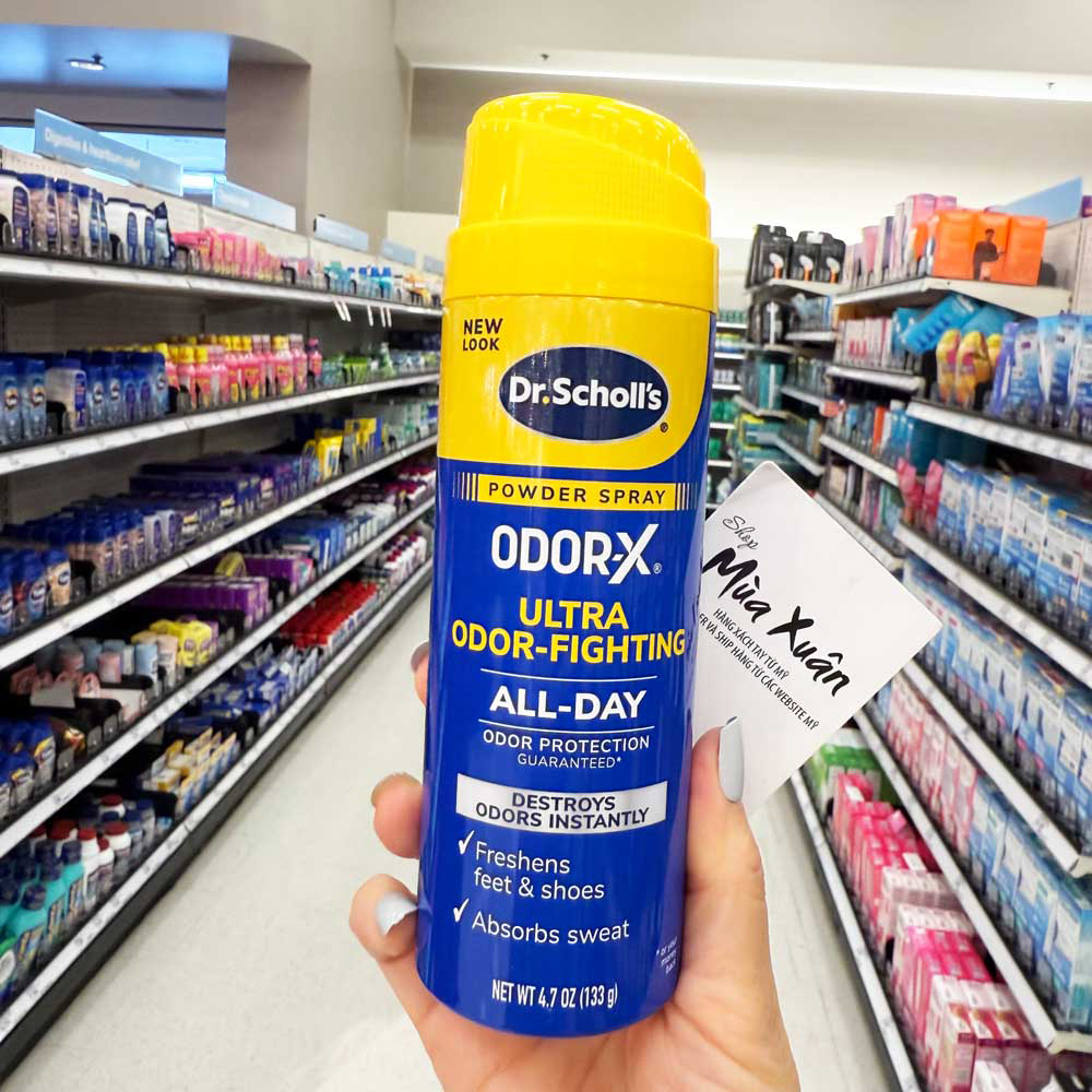 Phấn xịt khử mùi Dr. Scholl's Odor-X Ultra Odor-Fighting với các thành phần khử mùi mạnh mẽ giúp khử mùi ngay lập tức và thấm hút mồ hôi, đảm bảo bảo vệ khỏi mùi hôi cả ngày.
