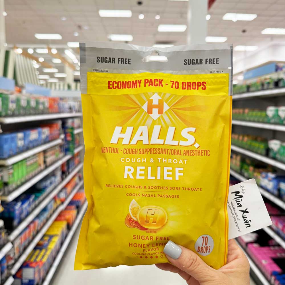 Kẹo ngậm Halls chống ho, làm dịu cổ họng và nghẹt mũi.