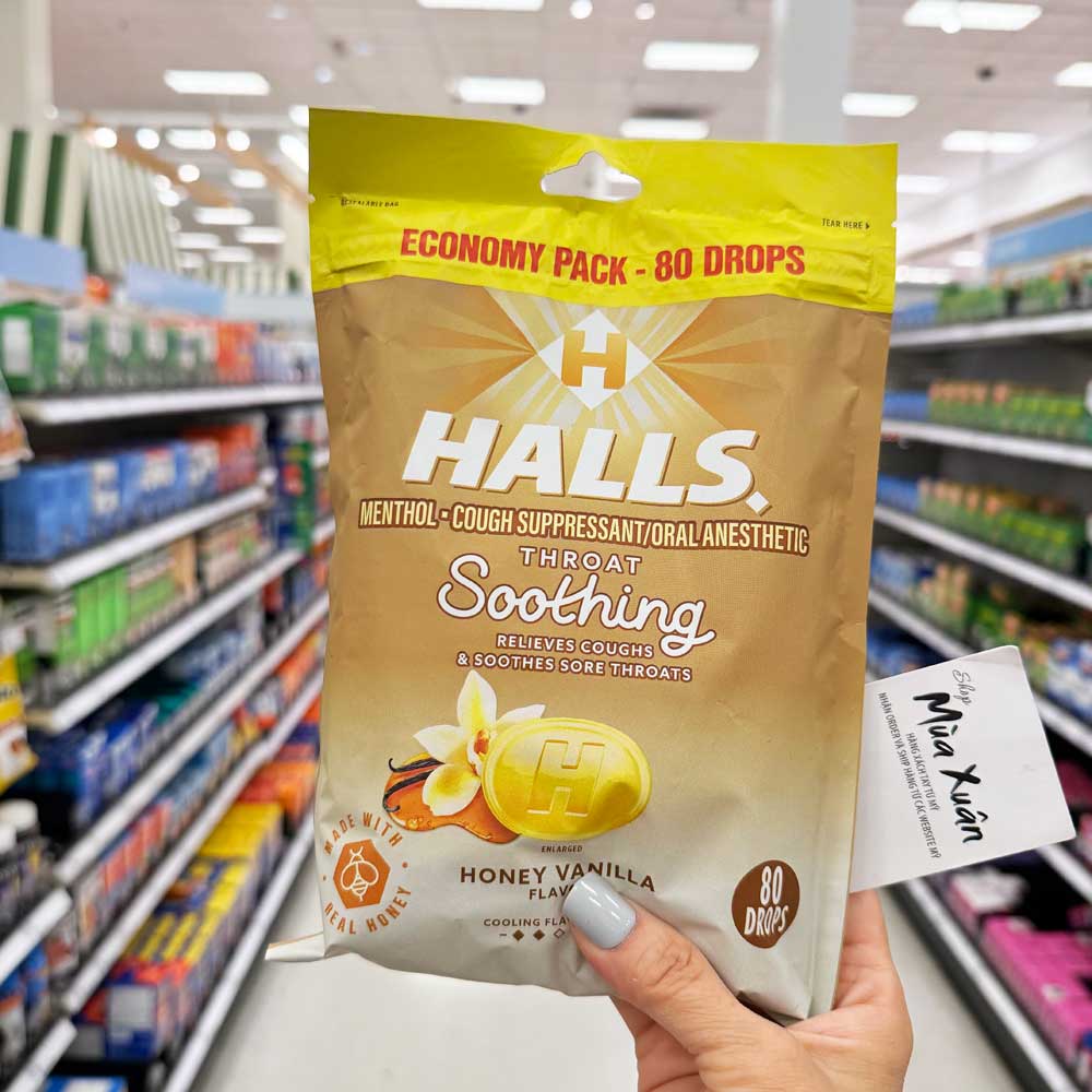 Kẹo ngậm Halls giảm ho, làm dịu cổ họng và nghẹt mũi.