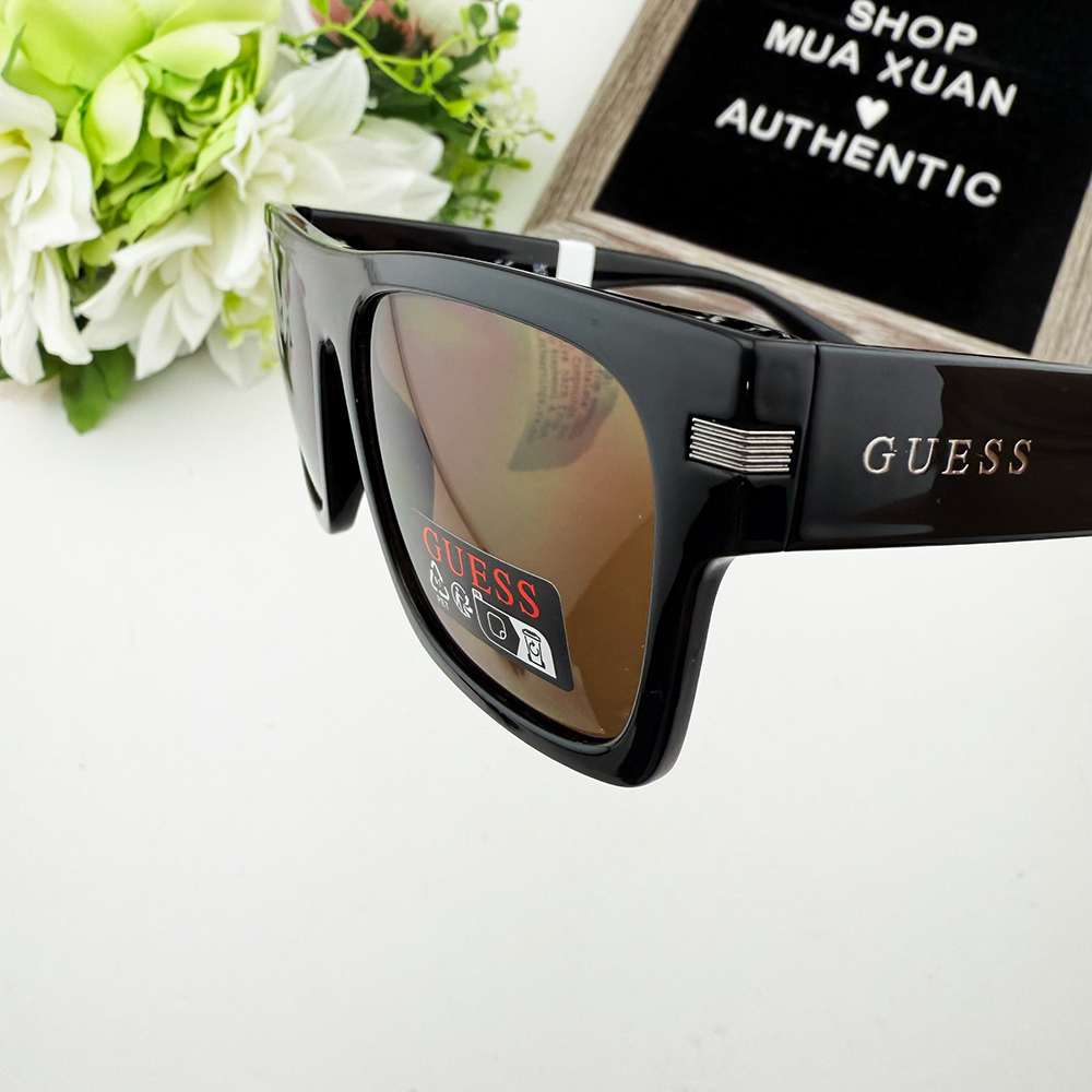 Chữ GUESS màu bạc được khắc chìm ở hai bên gọng kính tạo điểm nhấn thương hiệu.