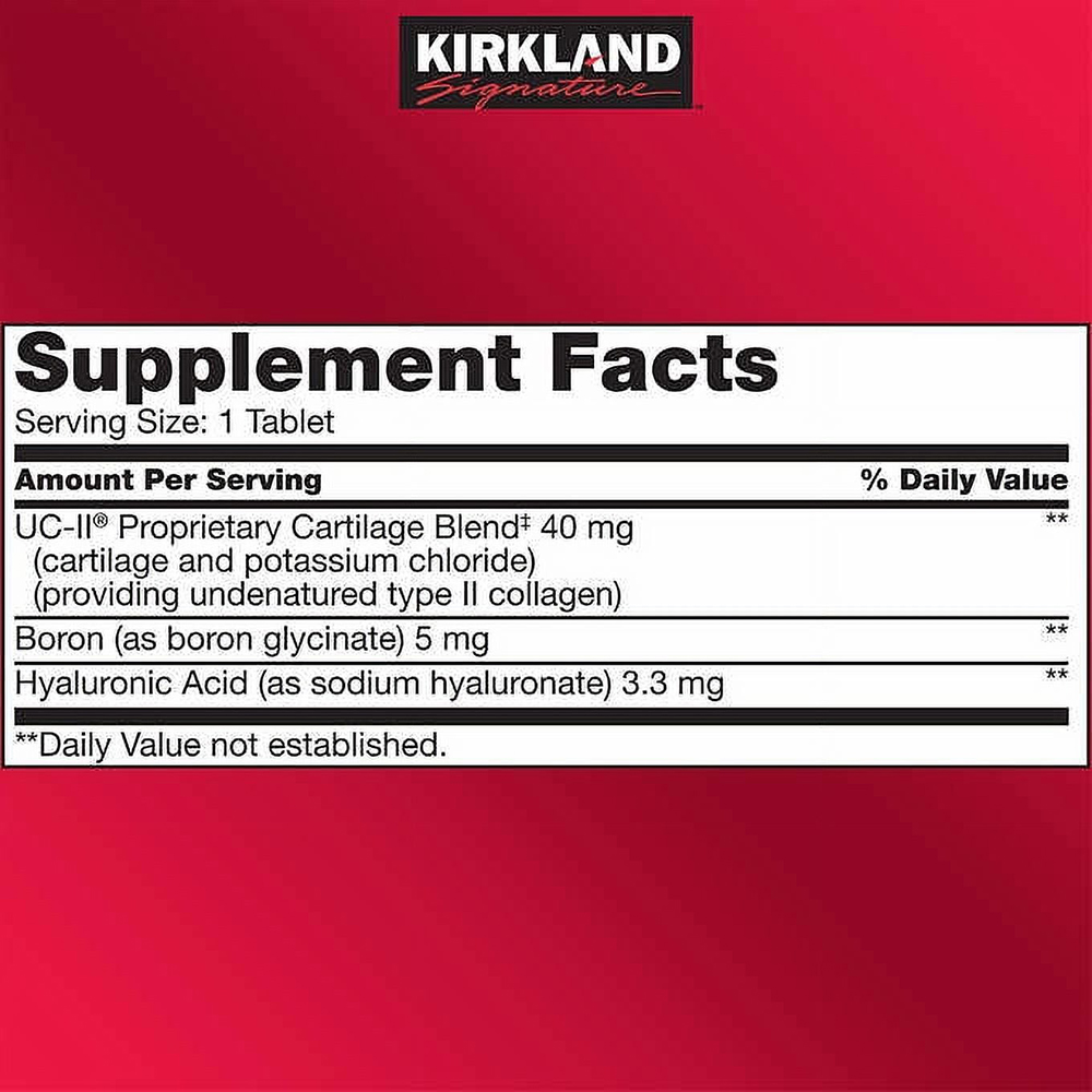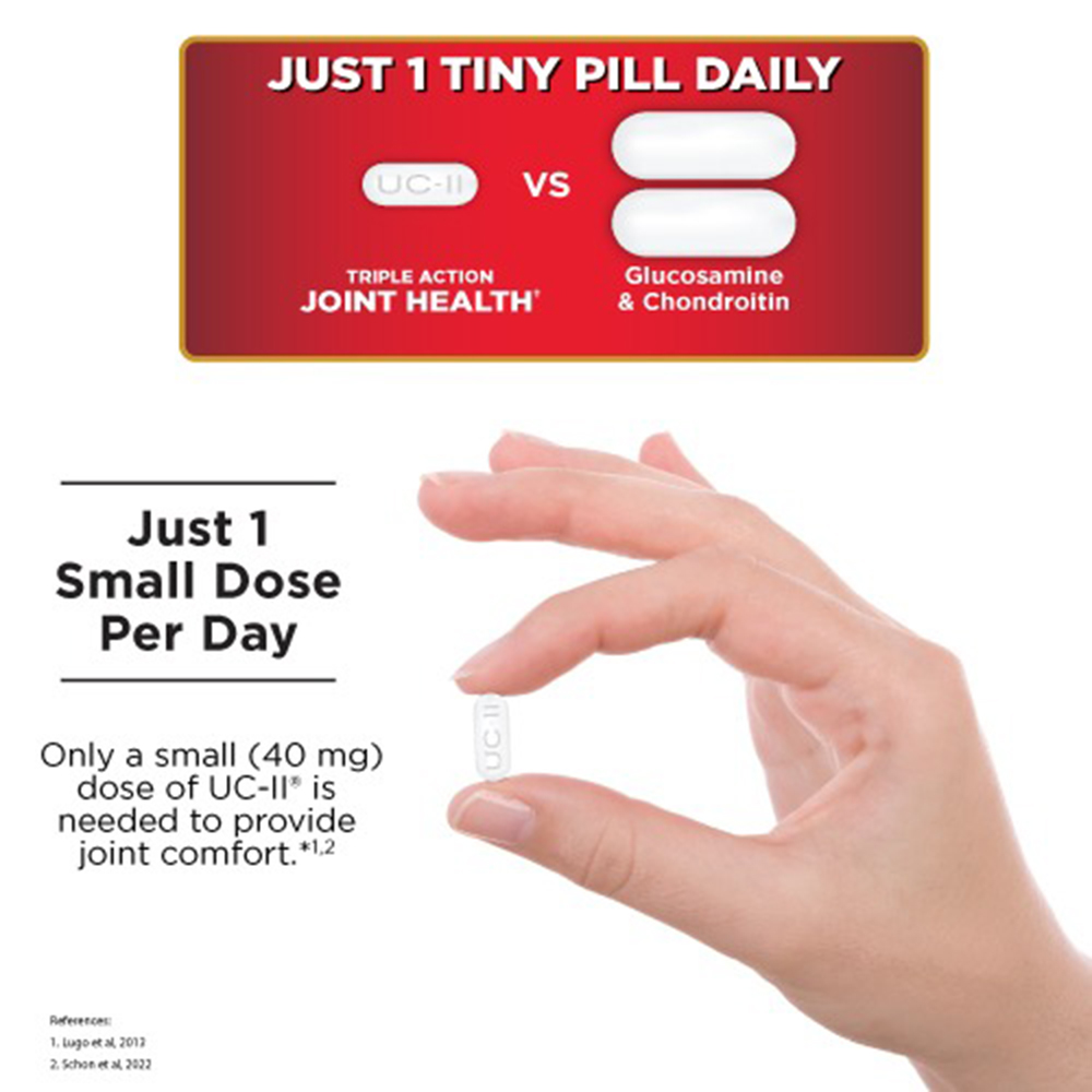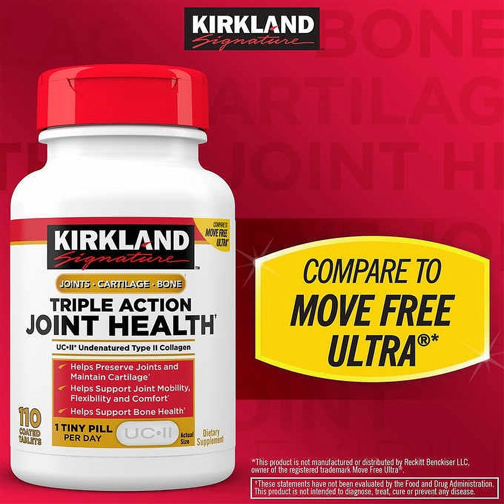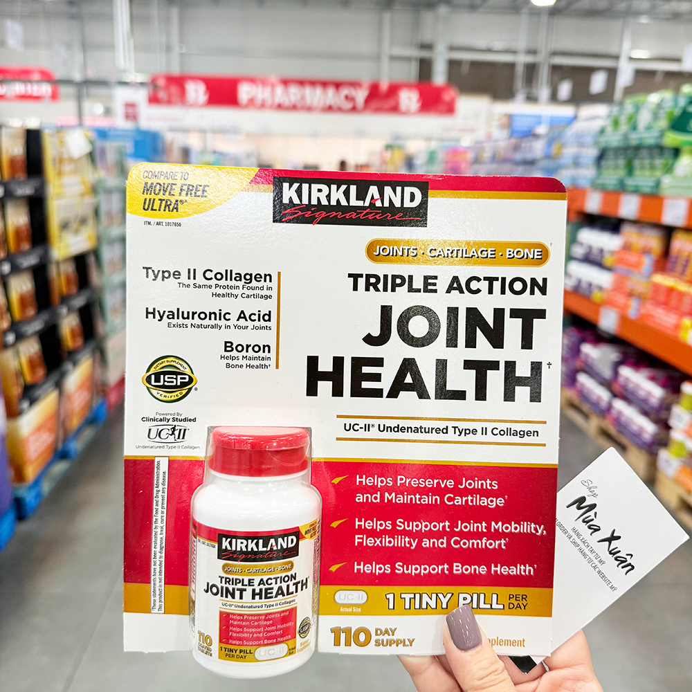 Kirkland Signature Triple Action Joint Health có chứa UC-II (collagen với collagen type II không biến tính), giúp hỗ trợ khả năng vận động, độ linh hoạt và sự thoải mái của khớp, đồng thời giúp bảo vệ khớp và duy trì sụn.