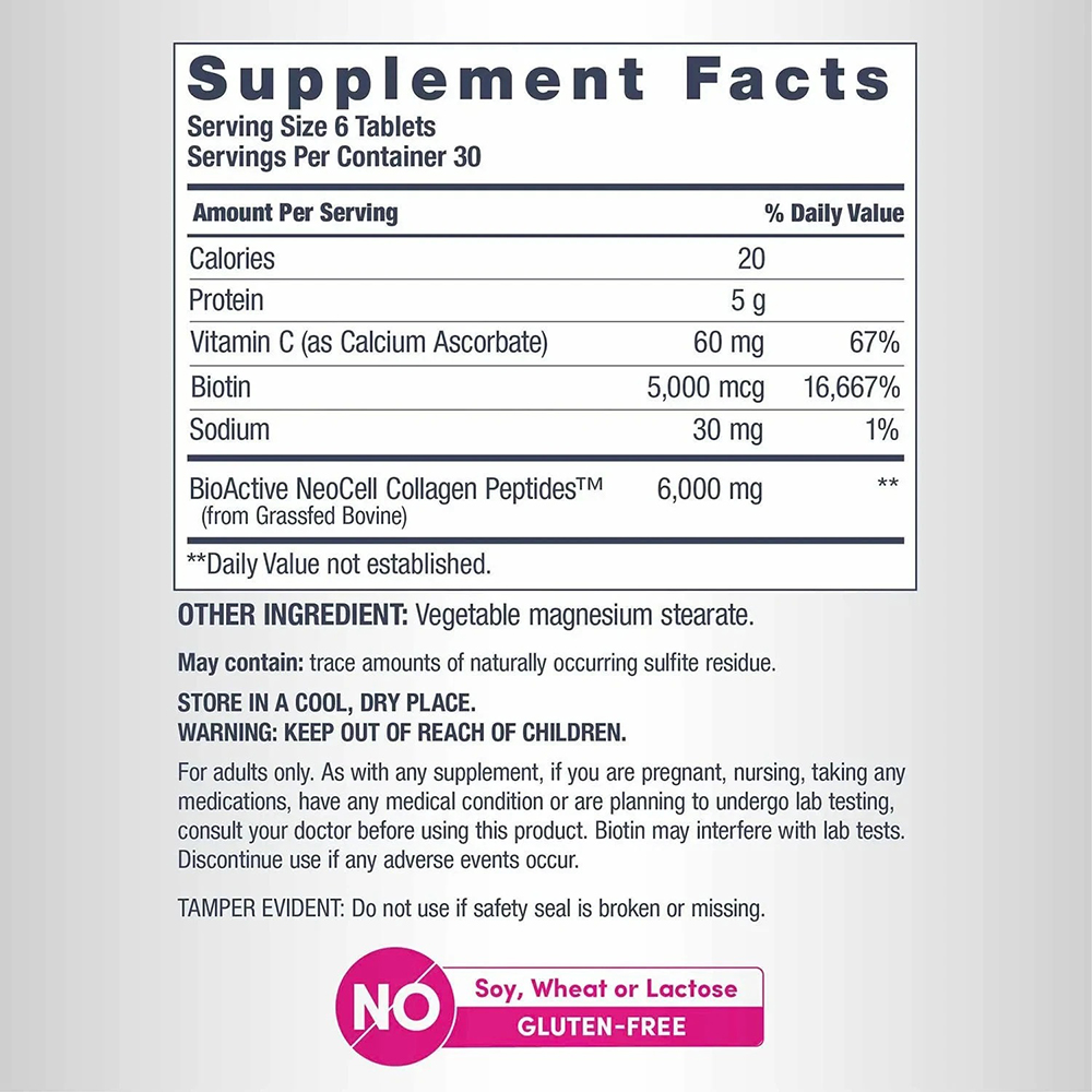 Mỗi khẩu phần cung cấp 6g BioActive NeoCell Collagen Peptides – nguồn collagen chất lượng cao được chiết xuất từ bò nuôi bằng cỏ tự nhiên, chứa Collagen Type 1 & Type 3 – hai loại collagen phổ biến nhất trong cơ thể, có mặt trong da, tóc, móng, gân, dây chằng và xương, mang đến sự hỗ trợ toàn diện, giúp duy trì làn da săn chắc và trẻ trung.