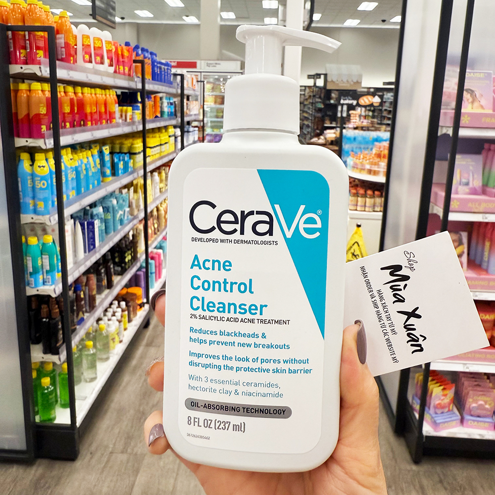 Rửa mặt CeraVe Acne Control kiểm soát mụn với 2% axit salicylic được bào chế để làm sạch mụn trứng cá, giảm mụn đầu đen và cải thiện sự xuất hiện của lỗ chân lông, trong khi đất sét Hectorite thanh lọc giúp hấp thụ dầu thừa.