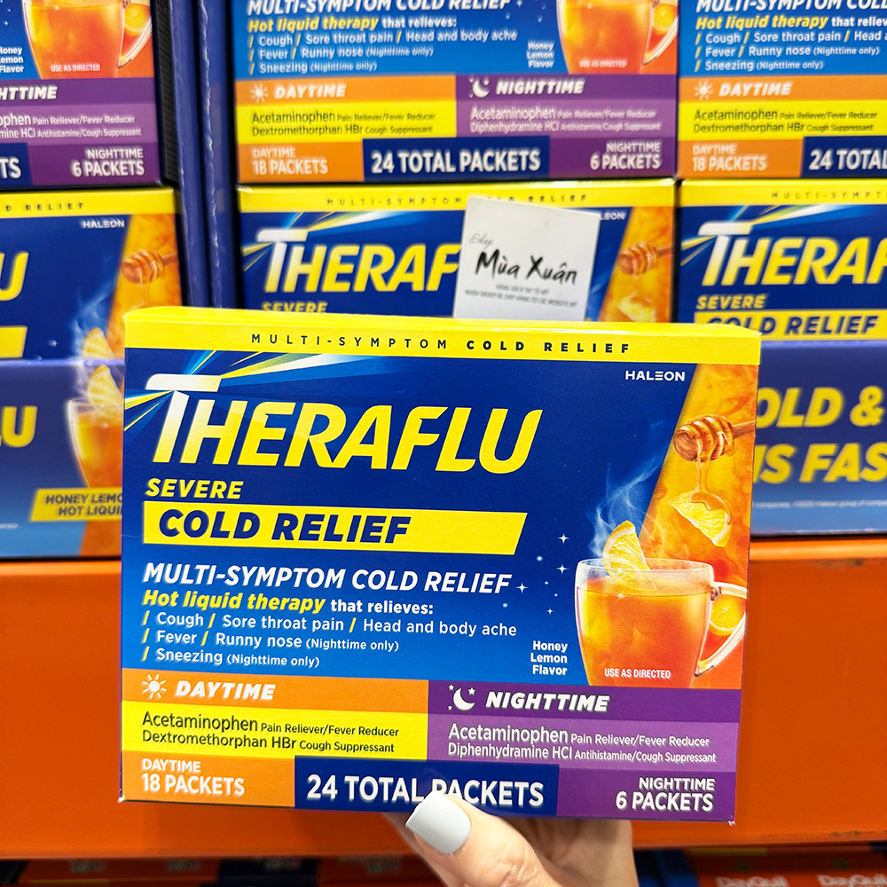 Theraflu Multi-Symptom + Nighttime Severe Cold & Cough, 24 gói 850.000 ₫ Mã sản phẩm 300670007171 Tình trạng Tạm hết Phí vận chuyển Có phí vận chuyển(Xem ước tính) Chia sẻ Mô tả sản phẩm Hướng dẫn sử dụng Bột hòa tan Theraflu Multi-Symptom + Nighttime Severe Cold & Cough giúp làm giảm các triệu chứng cảm lạnh và cảm cúm có tác dụng nhanh chóng trong mỗi gói với hương vị trà và mật ong dễ uống. Hộp gồm 24 gói: 18 gói ban ngày Multi -Symptom Severe Cold làm giảm ho, nghẹt mũi, đau họng, nhức đầu, đau nhức cơ thể và hạ sốt tạm thời. 6 gói ban đêm Severe Cold & Cough giúp giảm ho, nghẹt mũi, đau họng, nhức đầu, đau nhức cơ thể, sốt, sổ mũi và hắt hơi. Hòa tan 1 gói với ít nước ấm hoặc nước sôi và sử dụng khi nóng giúp xua tan cơn cảm cúm kịp thời và nhanh chóng. Hương vị chanh mật ong. Nhập từ Mỹ. Dành cho người lớn và trẻ em từ 12 tuổi trở lên. Dùng cách 4 giờ/lần khi có các triệu chứng cảm cúm. Không dùng quá 6 gói trong 24 giờ khi không có chỉ dẫn của bác sĩ. Mỗi gói hòa tan với 240ml nước ấm.