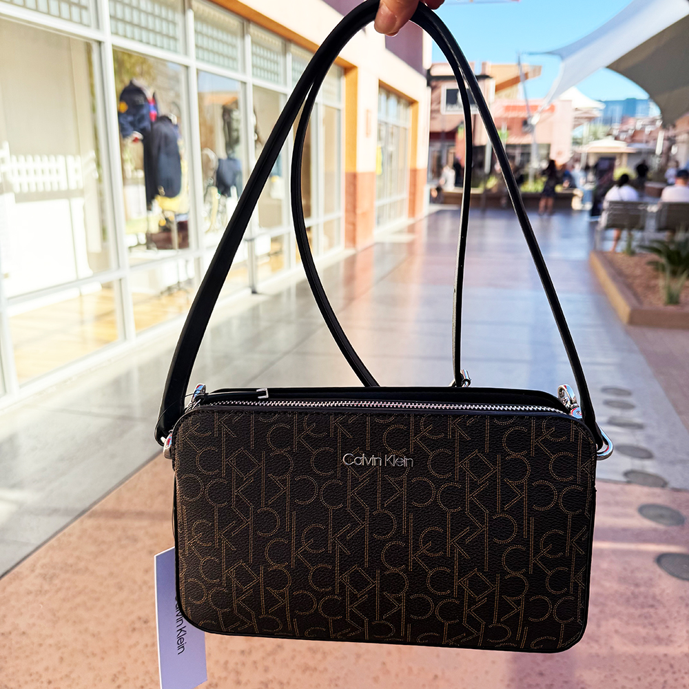 Logo Calvin Klein bằng kim loại sáng bóng đính ở mặt trước, kết hợp họa tiết tên thương hiệu in khắp bề mặt túi, tạo sự nhận diện đẳng cấp.