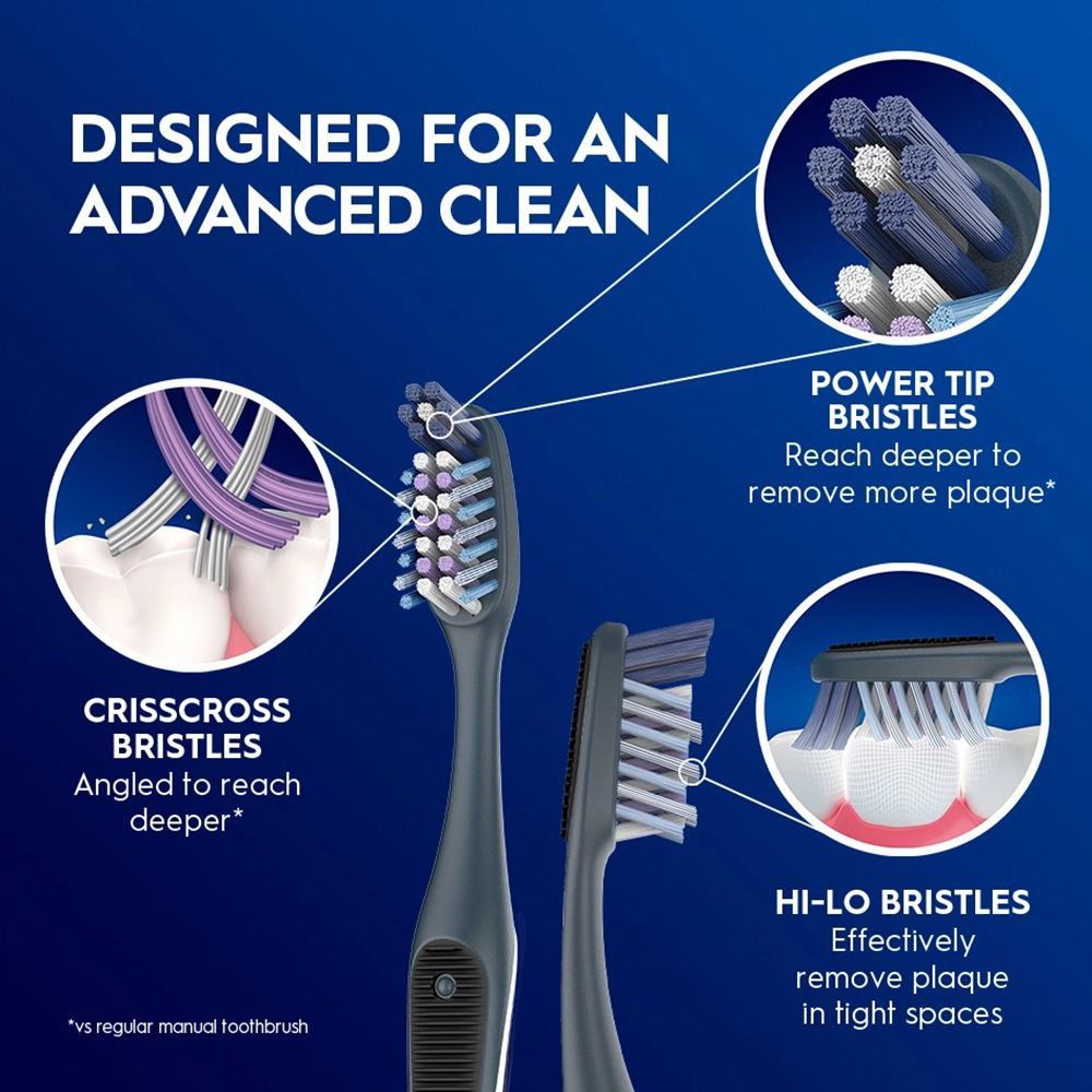 Bàn chải đánh răng Oral-B CrossAction Pro-Advanced được trang bị lông bàn chải CrissCross mạnh mẽ, loại bỏ mảng bám hiệu quả, đồng thời nhẹ nhàng với nướu.