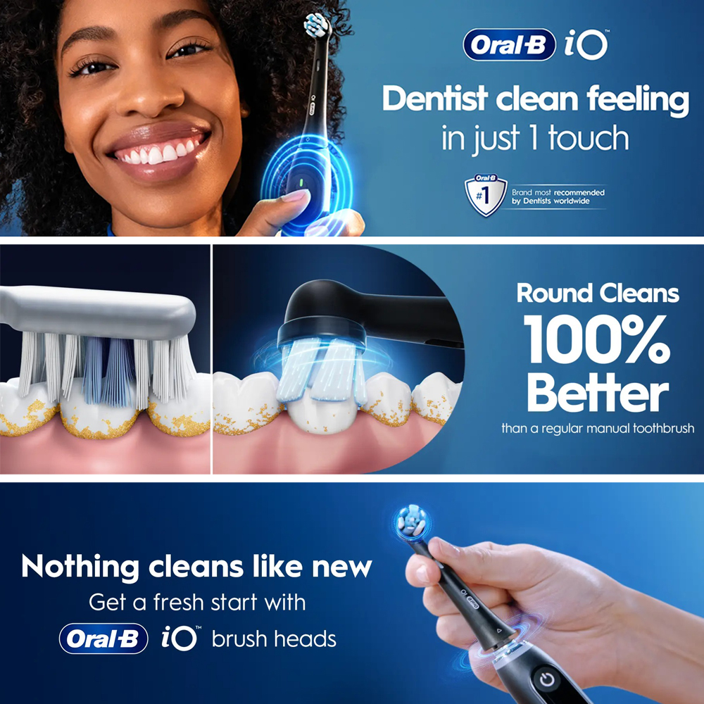 Bàn chải điện Oral-B iO Complete Clean kết hợp các rung động vi mô mạnh mẽ nhưng nhẹ nhàng với đầu bàn chải tròn lấy cảm hứng từ nha sĩ của Oral-B, mang đến hàm răng trắng sáng, khỏe mạnh hơn.