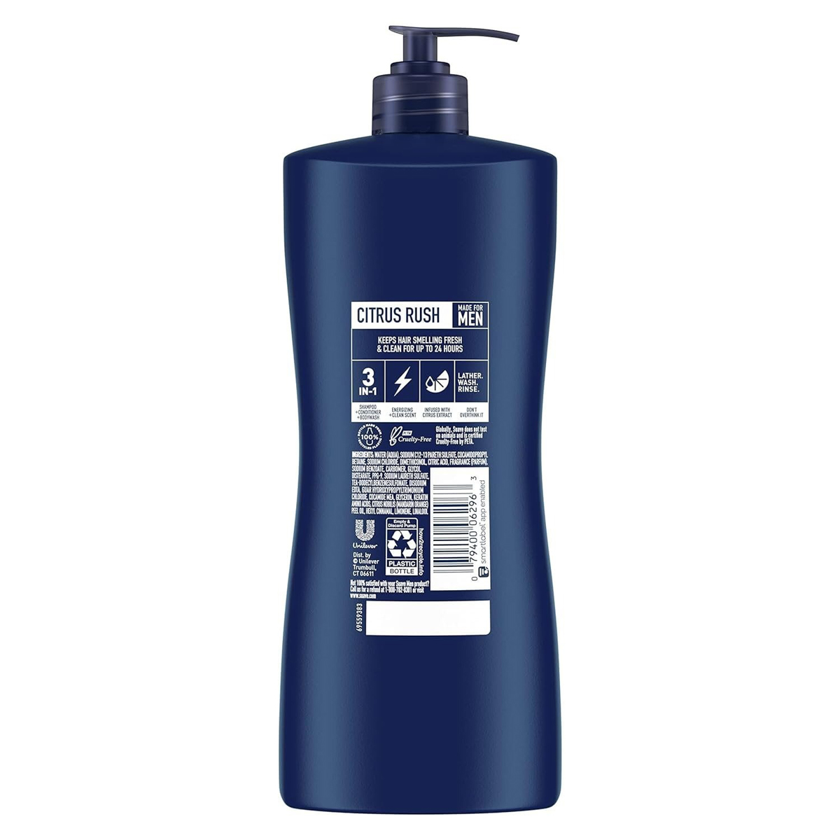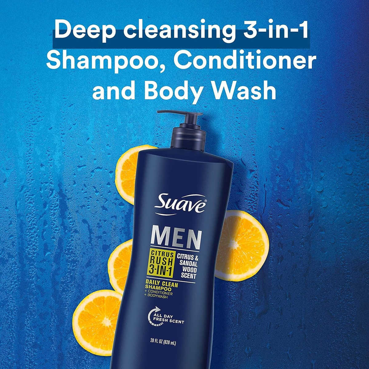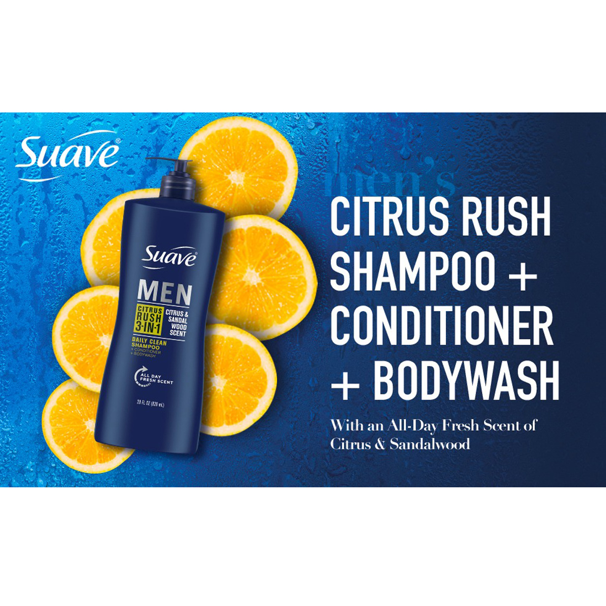 Suave Men Citrus Rush 3-in-1 có công thức ba tác dụng với dầu gội, dầu xả và sữa tắm tất cả trong một.