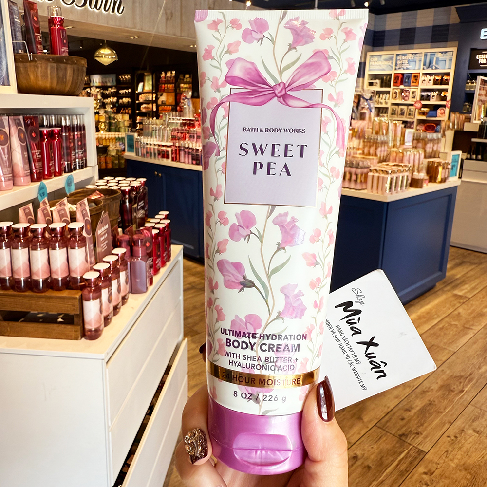 Kem dưỡng da Bath & Body Works Sweet Pea như một bó hoa tươi tắn, ngọt ngào với sự kết hợp của đậu ngọt, lê mọng nước, hoa lan Nam Phi, quả mâm xôi mọng nước và xạ hương dịu nhẹ.