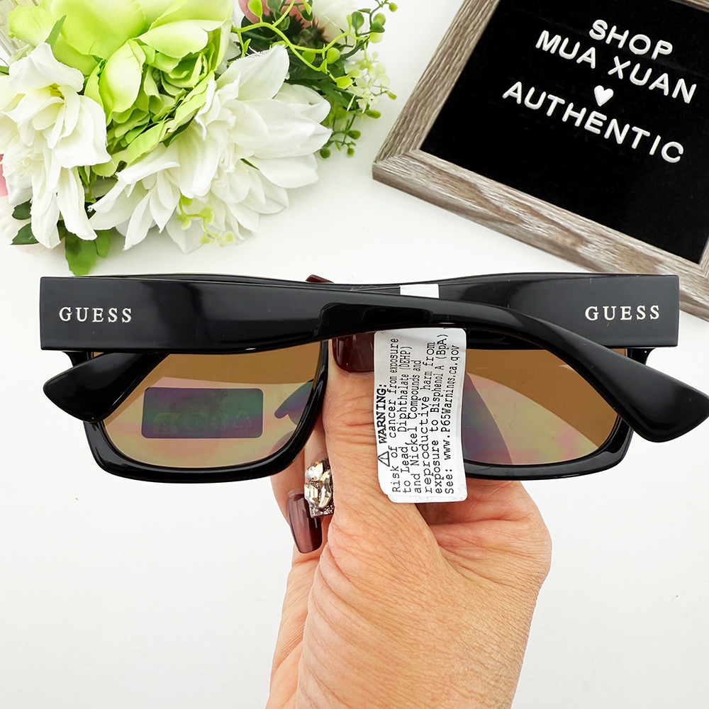 Chữ GUESS màu bạc được khắc chìm ở hai bên gọng kính tạo điểm nhấn thương hiệu.