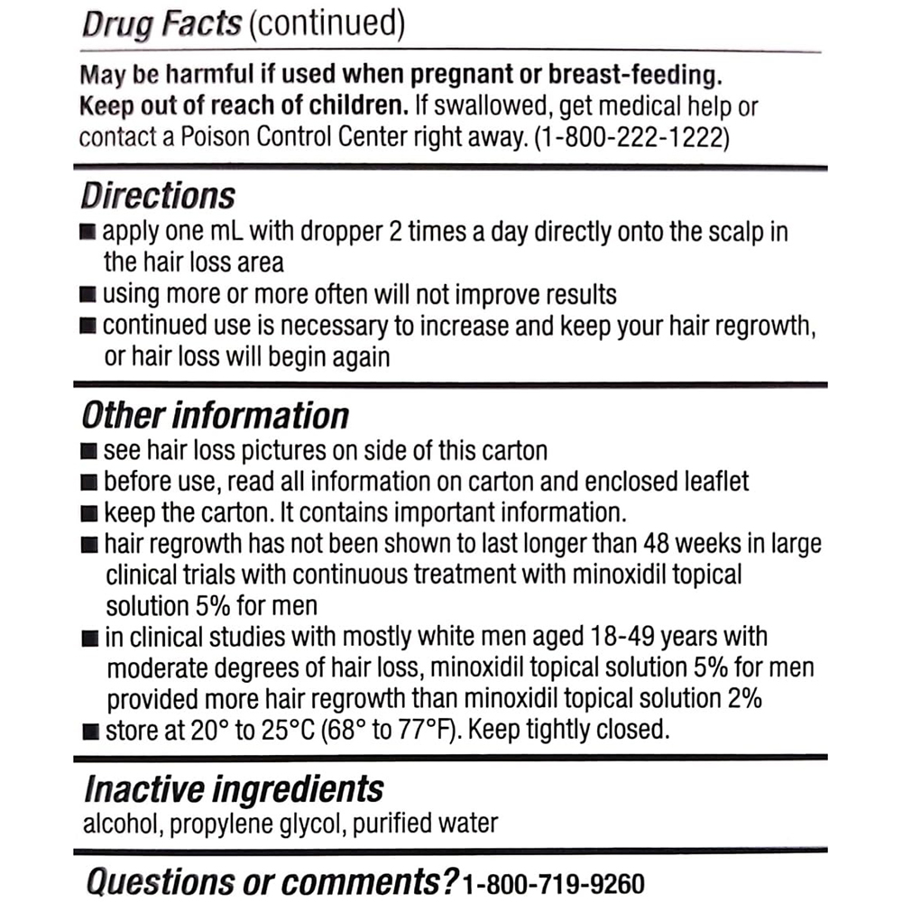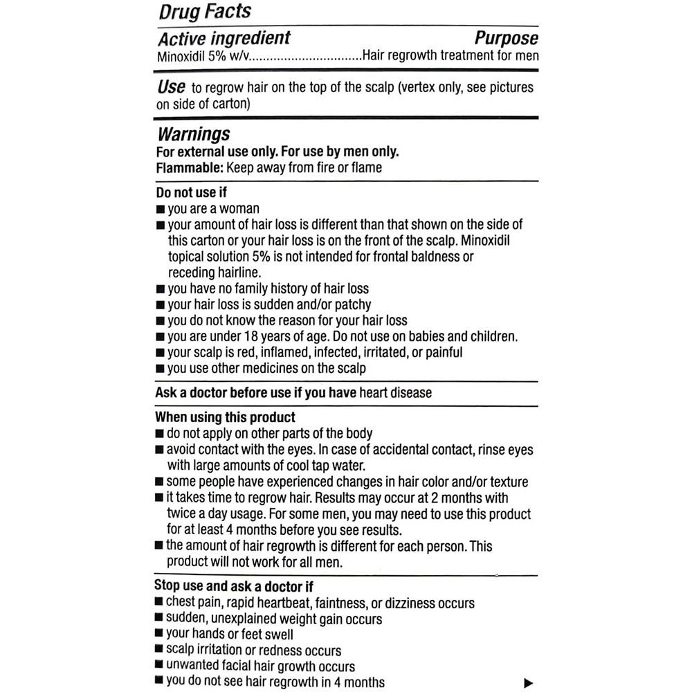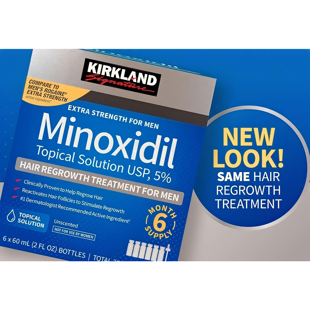Dung dịch bôi ngoài da Kirkland Signature Minoxidil Topical Solution USP 5% dành riêng cho nam giới, là sản phẩm điều trị rụng tóc tại chỗ cường độ cao, được sử dụng để giúp tóc mọc lại trên đỉnh đầu (chỉ dùng cho vùng đỉnh đầu, như được hiển thị trong tờ hướng dẫn sử dụng).