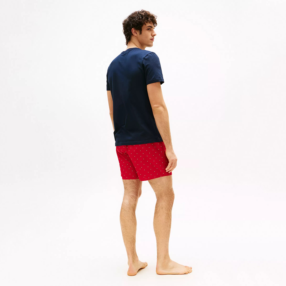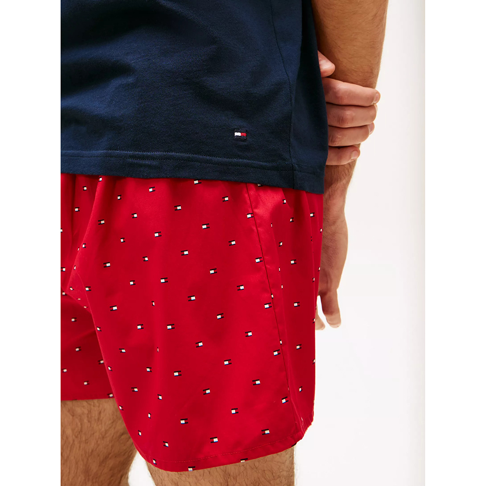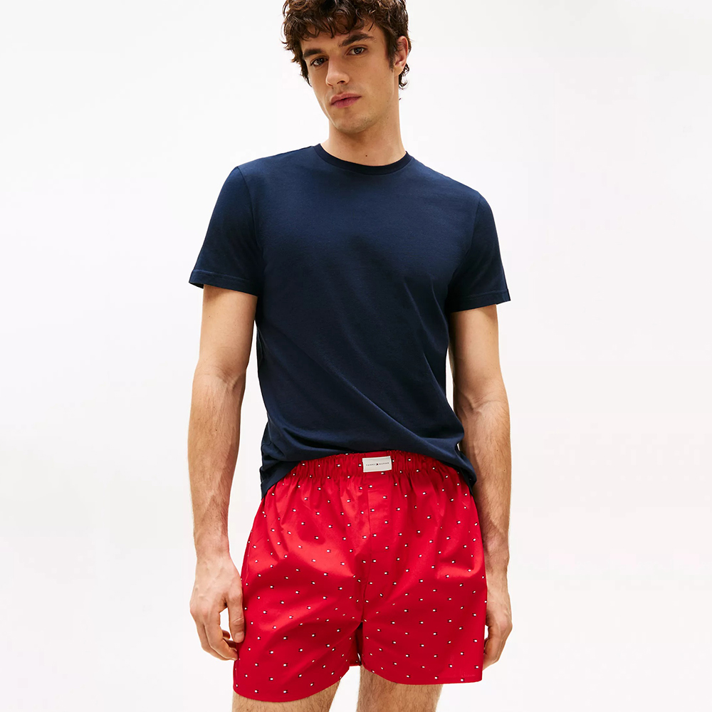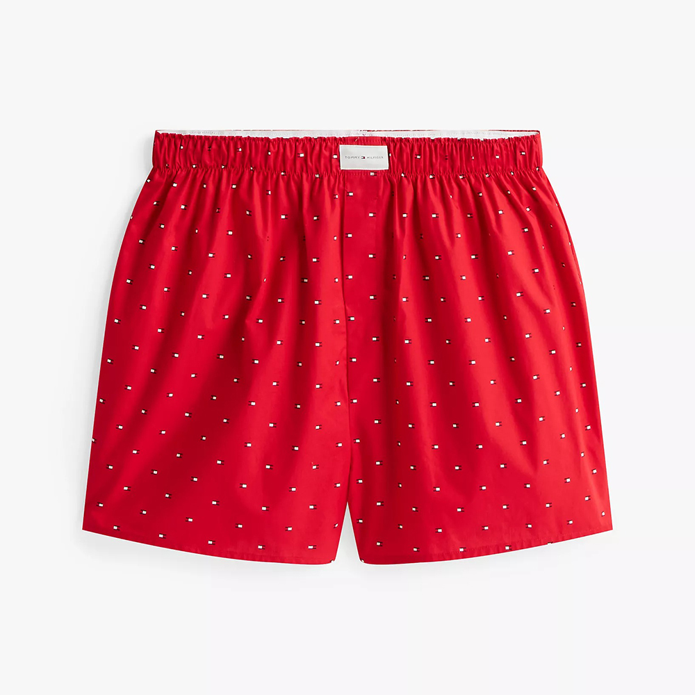 - 1 Quần đùi vải dệt mềm mại màu đỏ với logo cờ hiệu in trải đều, lưng thun co giãn thoải mái.