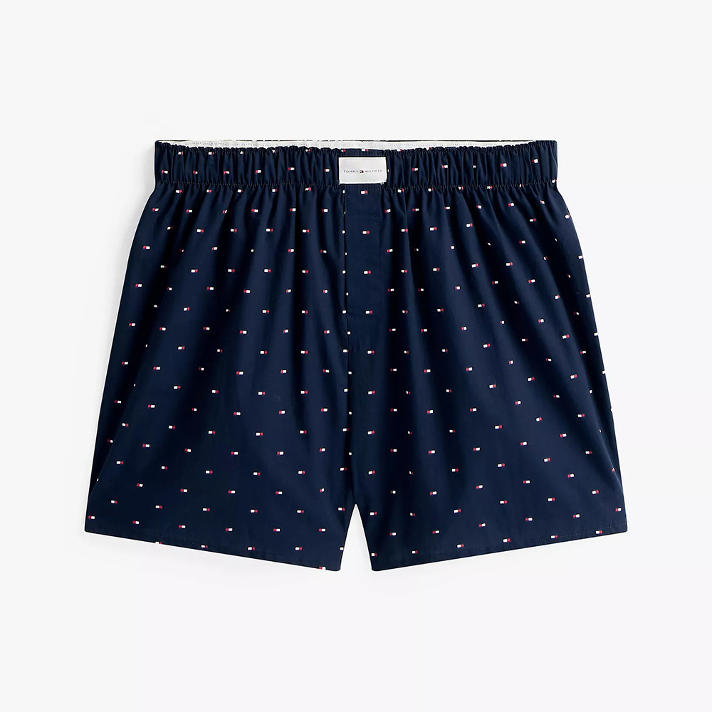 - 1 Quần đùi vải dệt mềm mại màu xanh đen với logo cờ hiệu in trải đều, lưng thun co giãn thoải mái.