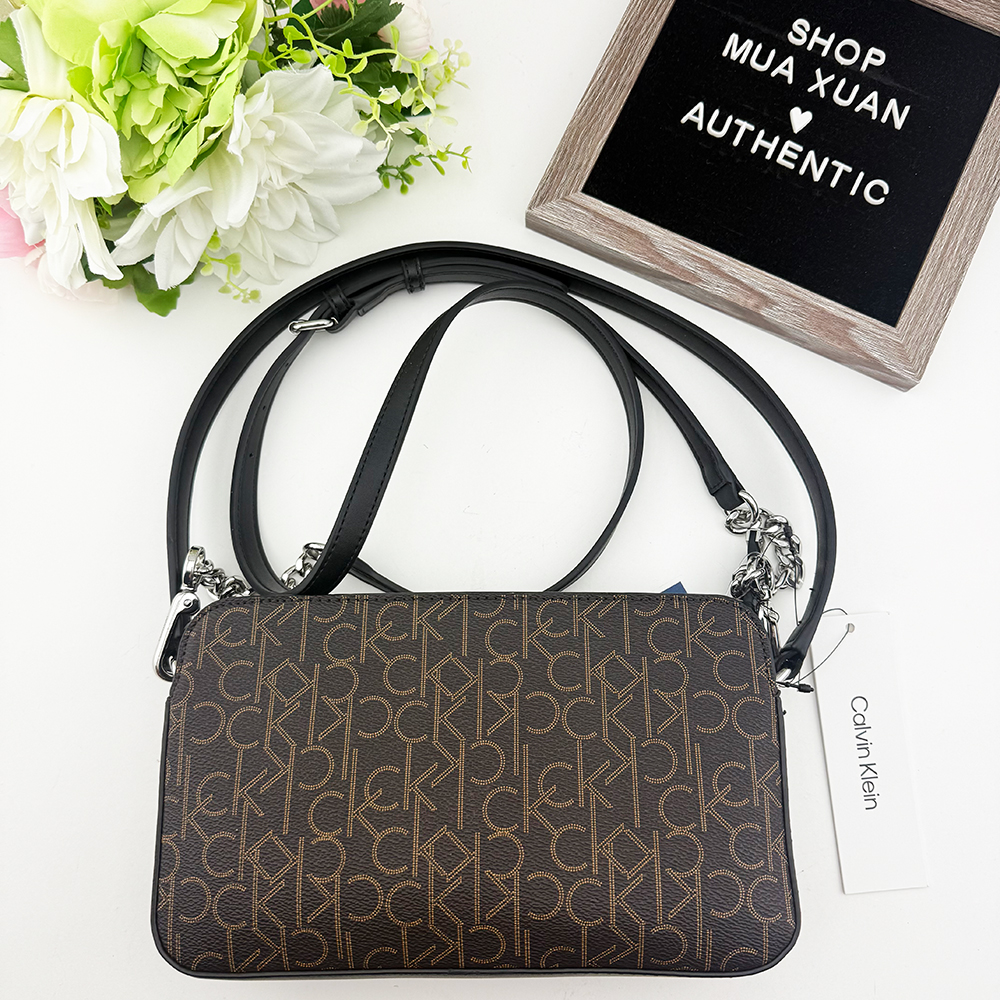 Logo Calvin Klein bằng kim loại sáng bóng đính ở mặt trước, kết hợp họa tiết tên thương hiệu in khắp bề mặt túi, tạo sự nhận diện đẳng cấp.
