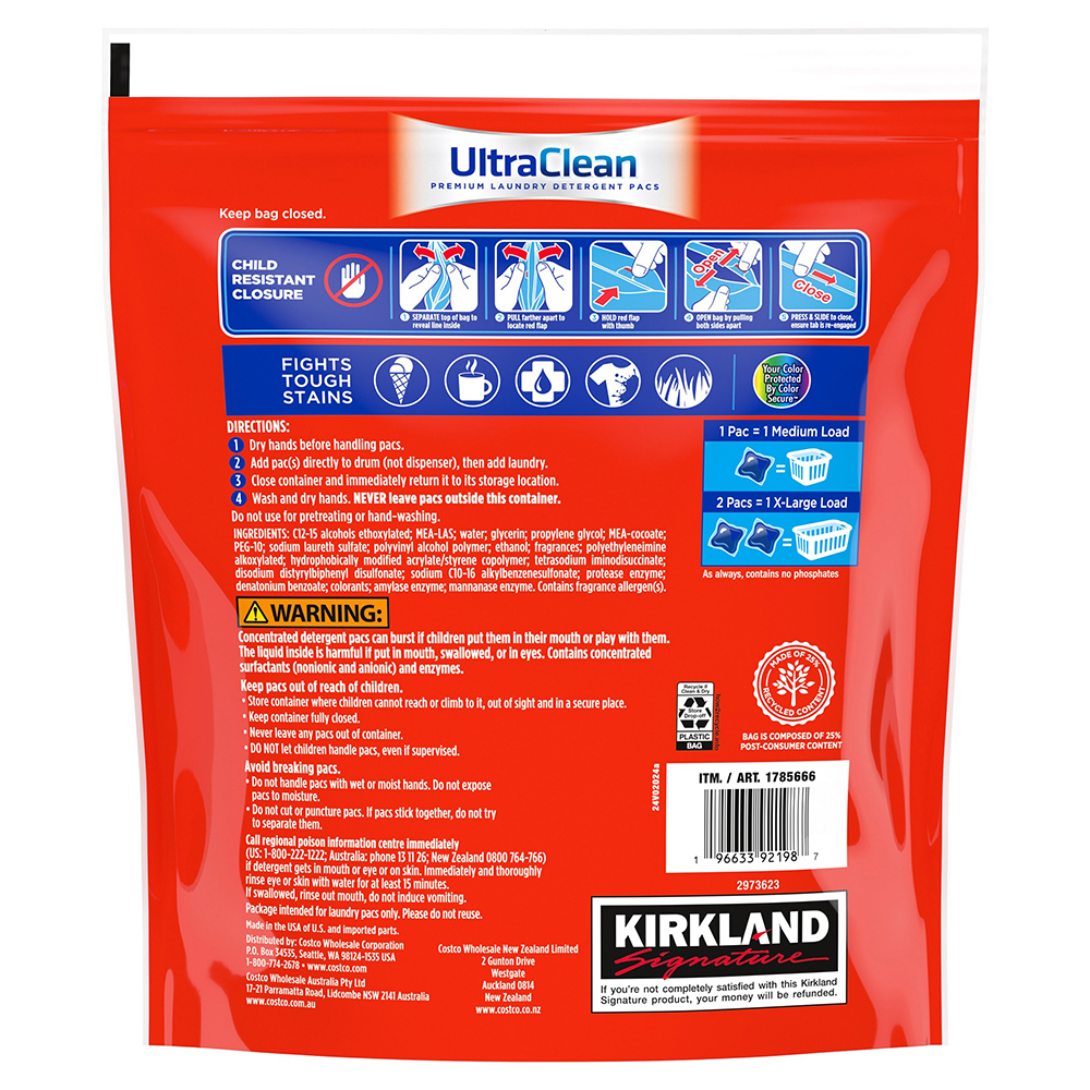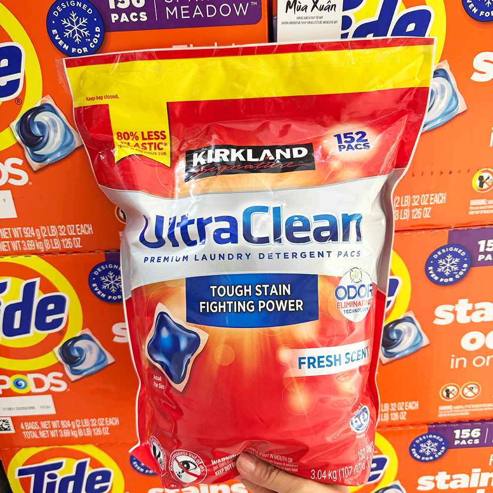 Viên giặt tẩy rửa cao cấp siêu sạch Kirkland với công thức kết hợp 2 trong 1: giặt và khử mùi.